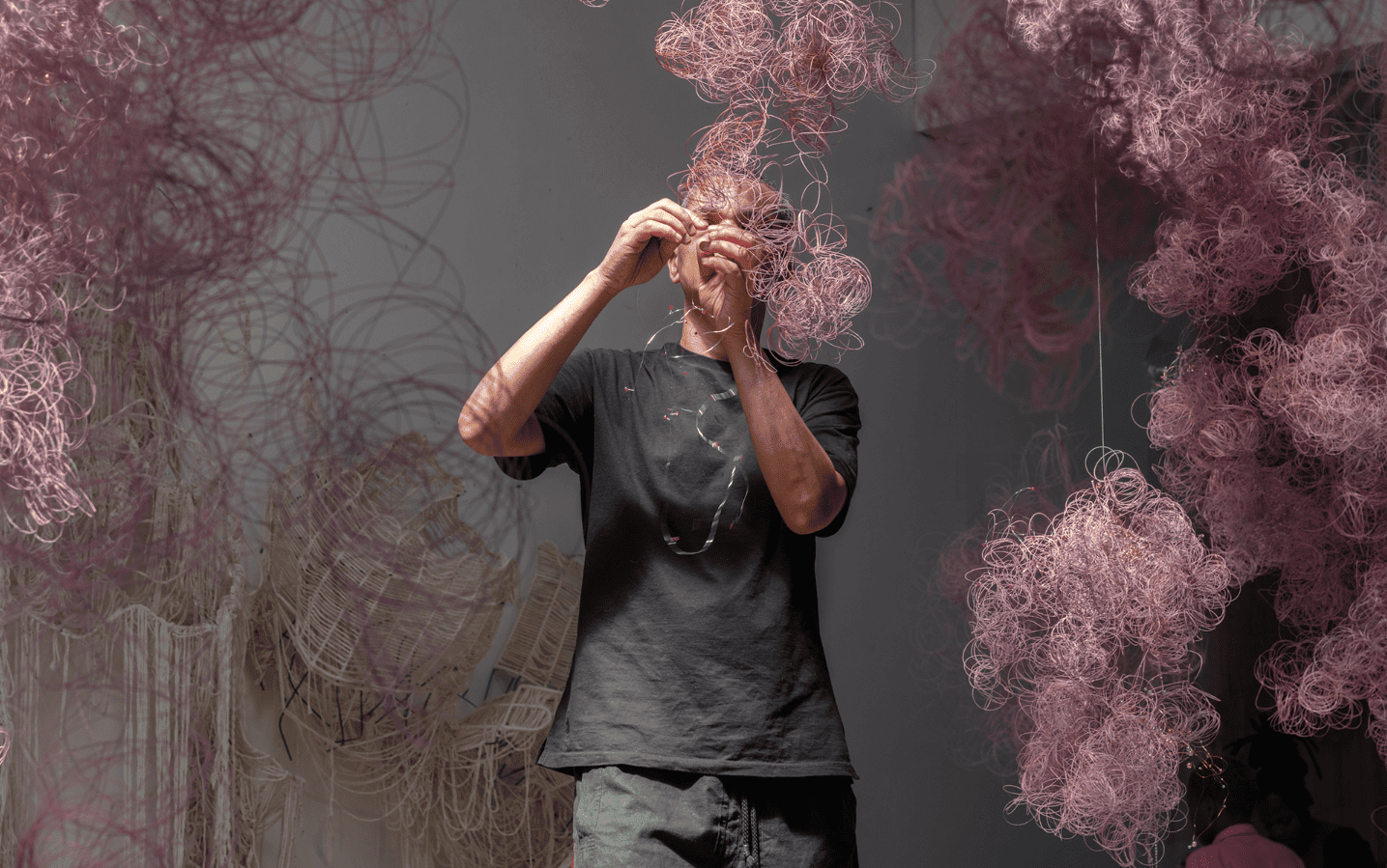 Igshaan Adams (Le Cap, 1982) transforme perles, chaînes, cordes et tissus en sculptures et tapisseries nourries de son enfance à Bonteheuvel, quartier ségrégué du Cap. Nuages suspendus de breloques et de métal, formes inspirées de danses traditionnelles et “impressions de danse” sur toile enregistrent la poussière, les gestes et les rituels. L’ensemble explore la mémoire du corps et les traces du trauma, tout en renversant l’idée de valeur : des matériaux dits banals deviennent porteurs d’esprit et d’appartenance. À vivre en immersion.