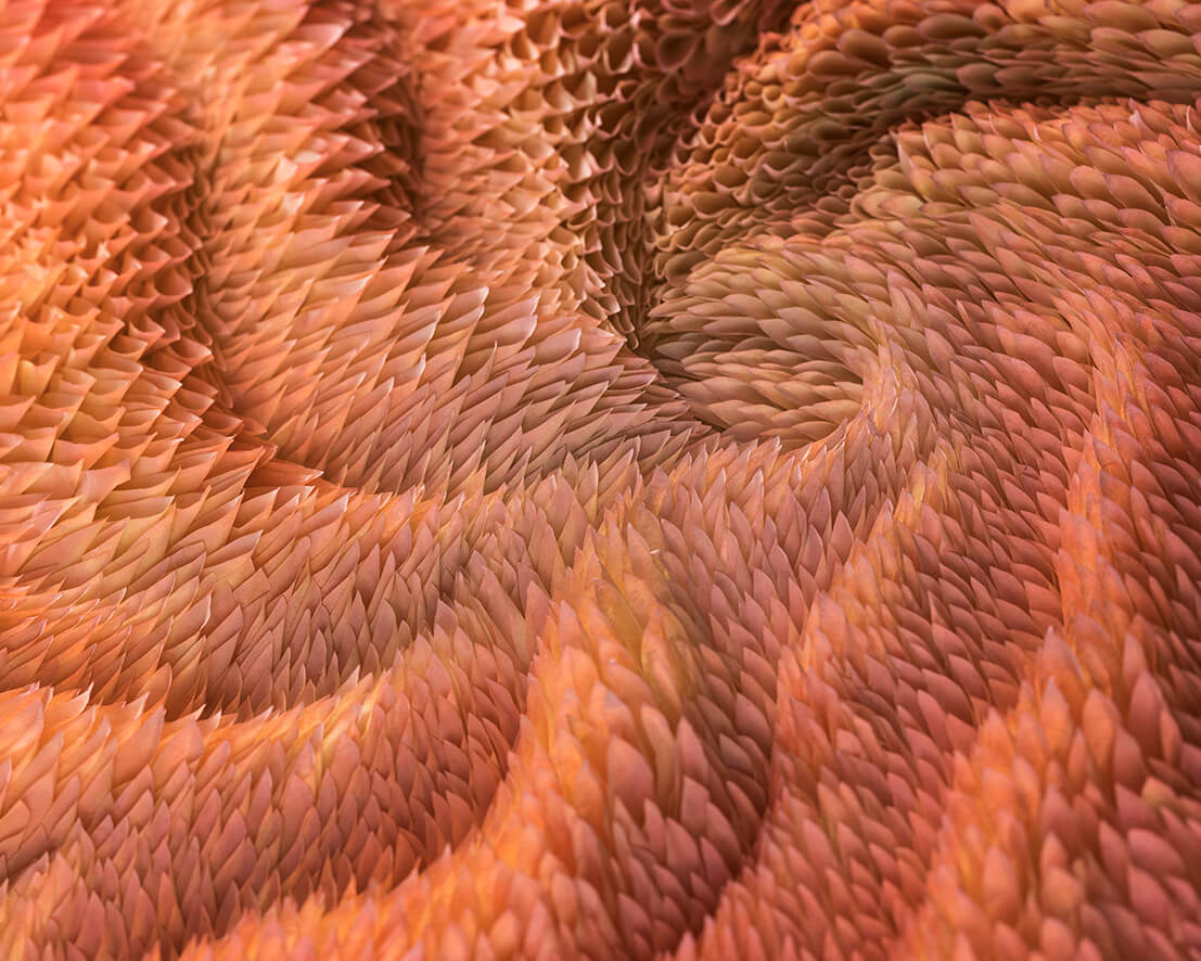 Par pliages et découpes, en répétant des éléments dans un ordre bien précis, il fait naître un enchevêtrement de formes organiques, à la manière de racines qui ondulent en rhizomes. Le papier se charge d’énergie, s’élève en vagues ou forme des compositions en spirale, telles des vortex naissant de deux dynamiques distinctes. Une production d’une technicité vertigineuse.
