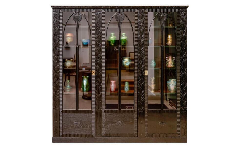 Bibliothèque de Hans Bolek pour la fabrique de meubles August Ungethüm, 1913, verre et chêne, 197,5 x 200 x 40 cm. © Kunsthandel Florian Kolhammer