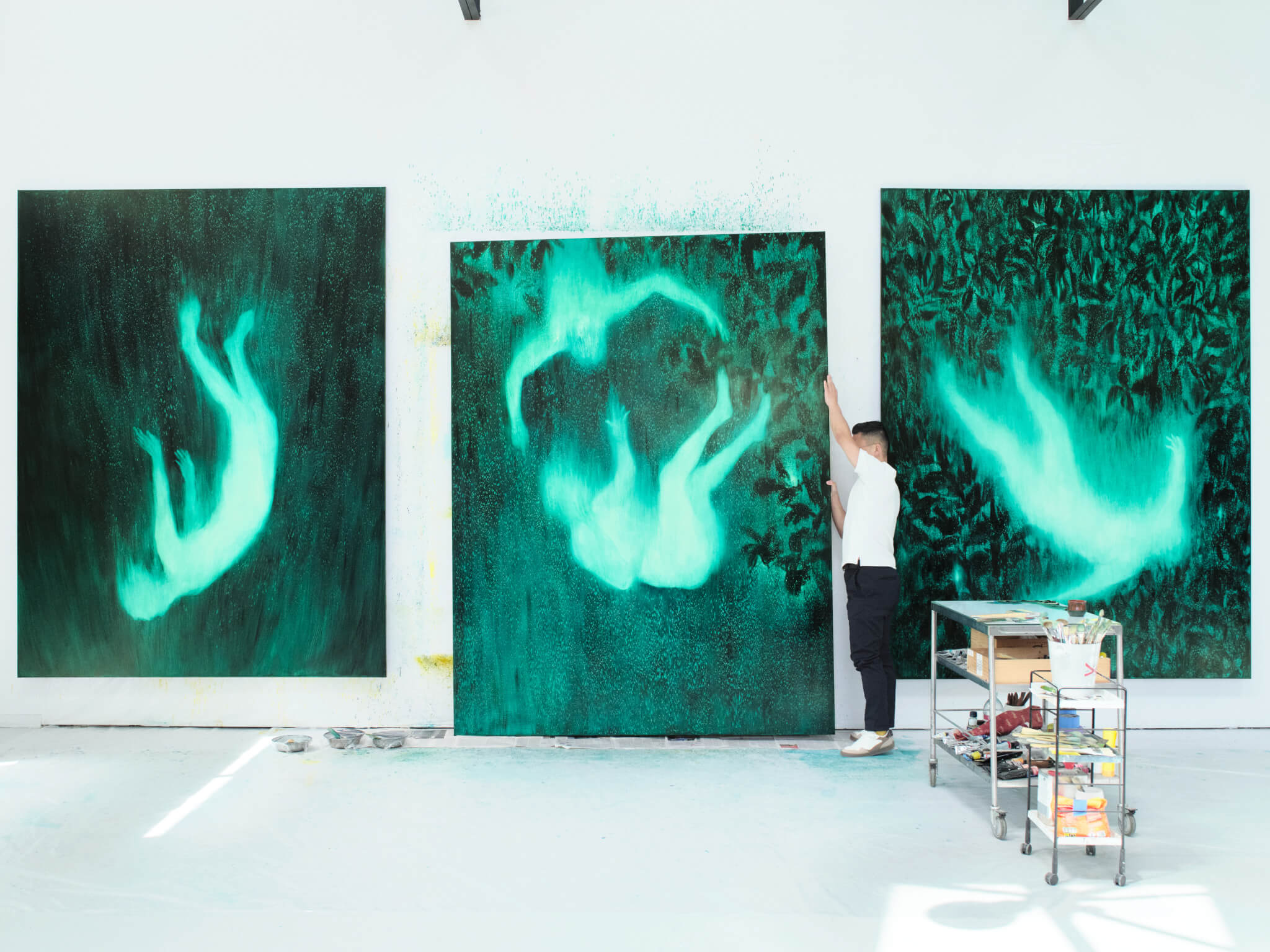 – Je prépare un thé, en général un thé vert. Ma région natale, l’Anhui en Chine, est connue pour ses thés verts, notamment le Houkui, aux grandes feuilles aplaties et nervurées. Ce thé est aussi porteur de belles légendes. Ce moment est essentiel : je m’assieds devant la toile, je respire, je réfléchis aux prochaines étapes.