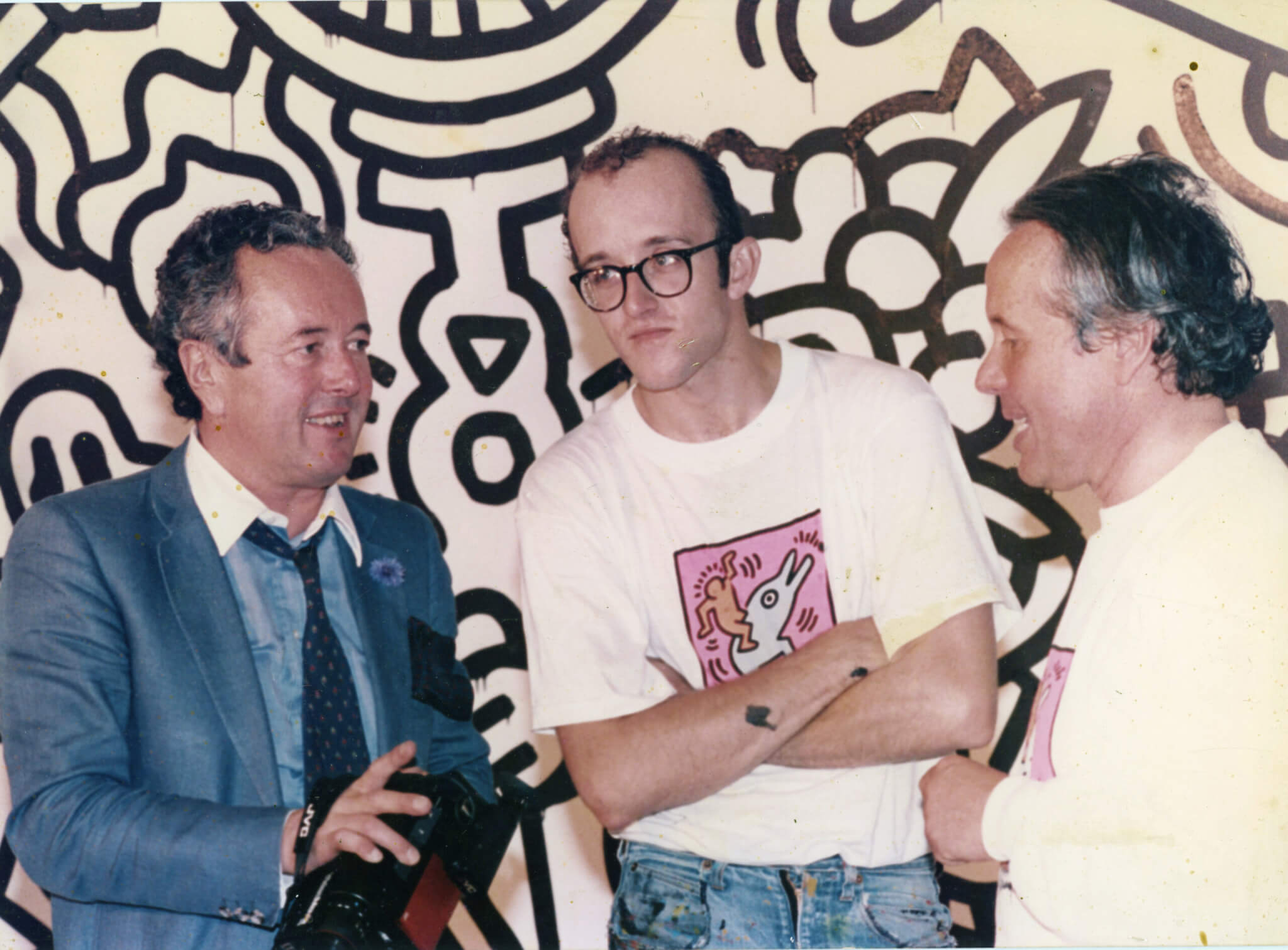 Keith Haring avec l’artiste et directeur du M HKA à Anvers, Flor Bex (à droite), lors de son inauguration en 1987 © Courtesy of M HKA, Anvers/The Keith Haring Foundation, New York