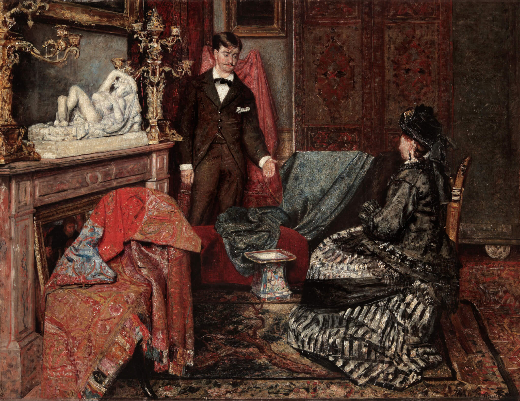Chez Sofie Van de Velde, les œuvres de l’artiste contemporain Felix De Clercq (°1997) se déclinent autour du thème de l’intérieur. Ce dernier s’est inspiré de peintres du XIXe siècle dont certains tableaux seront accrochés en miroir, dialogue entre l’intéressé et James Ensor ou Henri de Braekeleer représenté, notamment, par Le Châle d’Inde. La toile figure un salon bourgeois richement décoré grâce au pinceau minutieux et velouté d’un maître un injustement oublié.