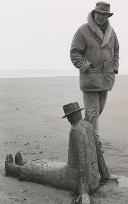 Jean-Michel Folon et son oeuvre “La Mer, ce grand sculpteur” installée sur la plage de Knokke-Heist. © DR