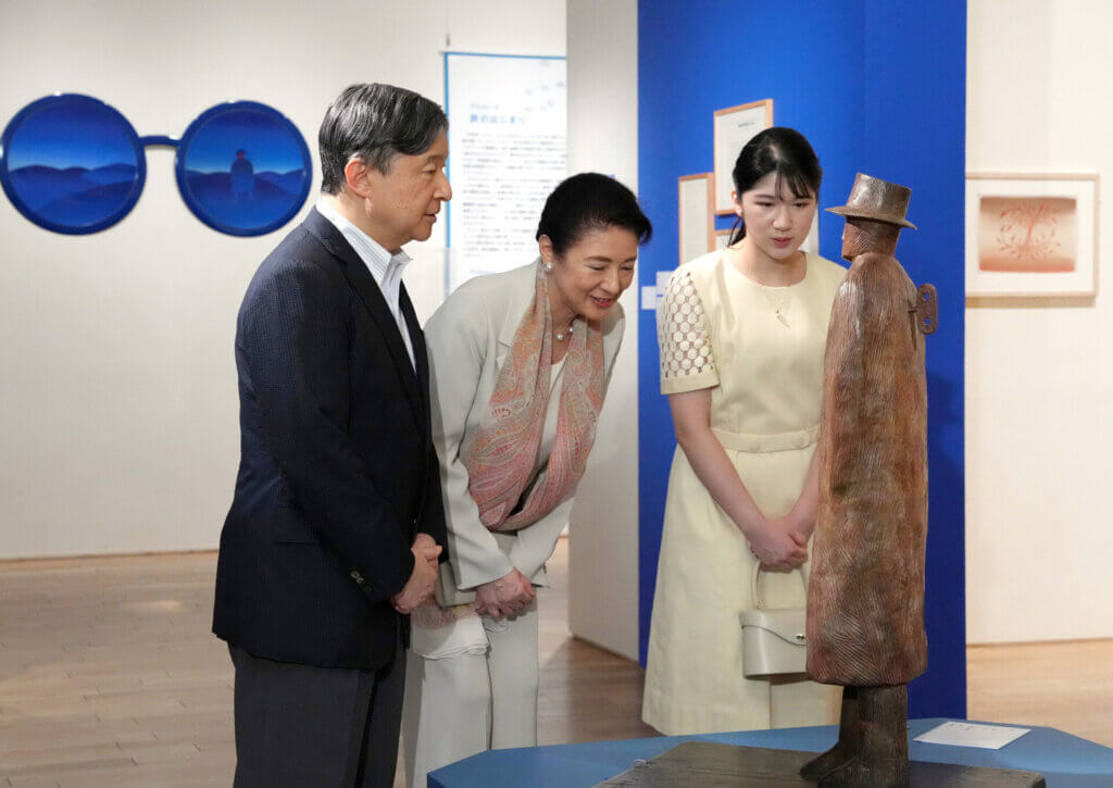Sa Majesté l’Empereur du Japon, accompagné de l’Impératrice et de Son Altesse Impériale la princesse Aiko, lors de la rétrospective Folon qui s’est tenue à la Tokyo Station Gallery en septembre 2024. © DR