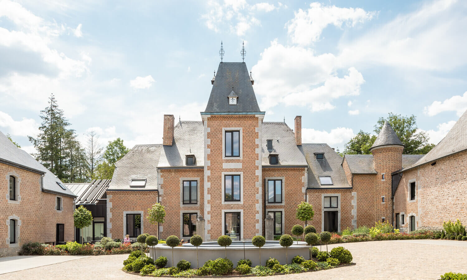 Le château, dont les origines remontent à plusieurs siècles, a traversé les époques en se transformant au fil des usages: relais de chasse, demeure de caractère, hôpital de campagne durant la Seconde Guerre mondiale. Cette mémoire, loin d’être gommée, nourrit aujourd’hui l’âme du lieu. La rénovation a su préserver l’esprit des bâtisses anciennes tout en y insufflant une esthétique résolument actuelle: lignes épurées, volumes aérés, matériaux nobles et palette de teintes inspirées des forêts ardennaises. L’ensemble compose une atmosphère à la fois élégante et profondément apaisante, comme si le temps s’y écoulait autrement.
