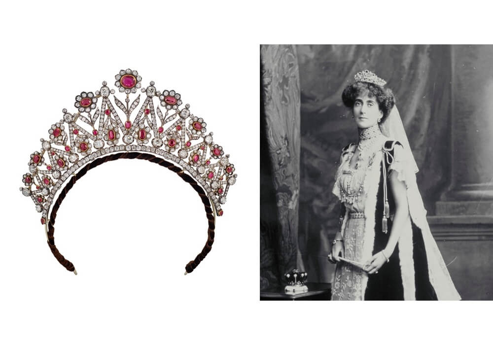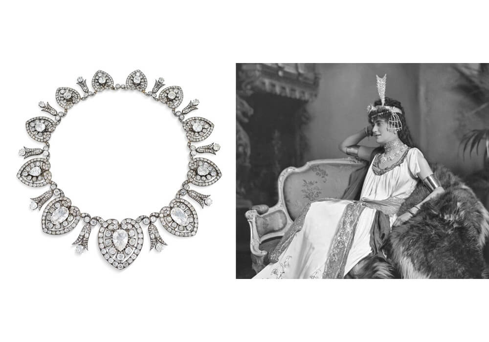 Chez Christie’s, c’est l’écrin de Lady Helena Violet Alice Fraser, Comtesse de Stradbroke (1874-1949) qui sera dispersé. Avant son mariage, elle assiste au bal de Devonshire House en 1897 qui commémore le jubilé de diamant de la reine Victoria. Helena y va déguisée en Dalila et porte le collier de diamants à palmettes qui figure dans la vente. L’année suivante, elle épouse George Rous, 3e comte de Stadbroke.