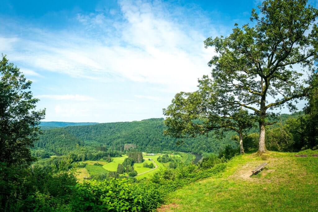 La vallée de la Semois est jalonnée de belvédères, mais le point de vue du “Jambon” figure parmi les plus spectaculaires. Depuis la crête, la rivière dessine une boucle parfaite de près de deux kilomètres, dont la silhouette évoque un jambon posé dans l’écrin forestier. Face à la plaine de Kelhan et à la réserve naturelle de Bohan-Membre, le lieu attire promeneurs et photographes en quête de paysages ardennais à couper le souffle.
