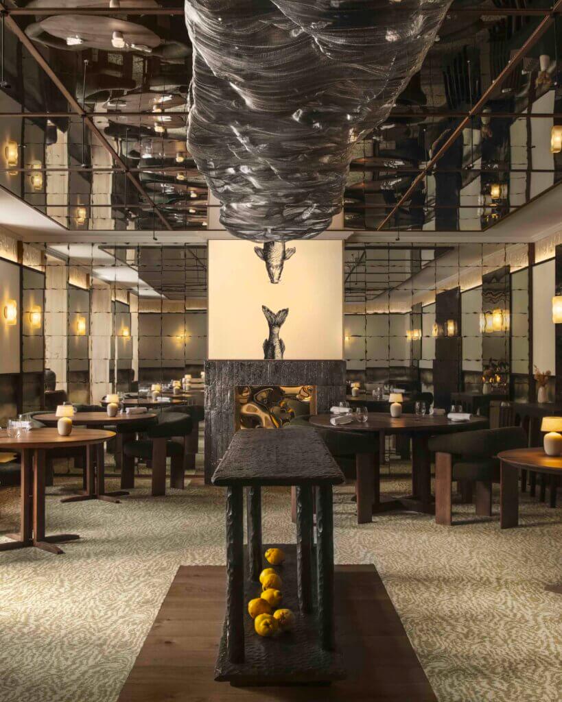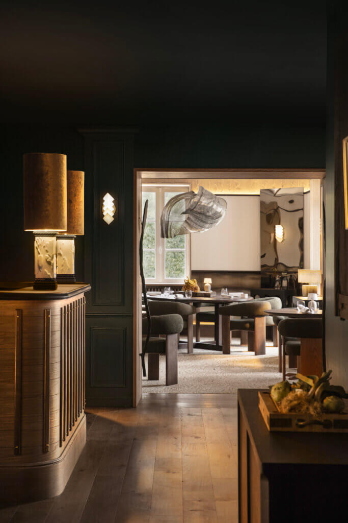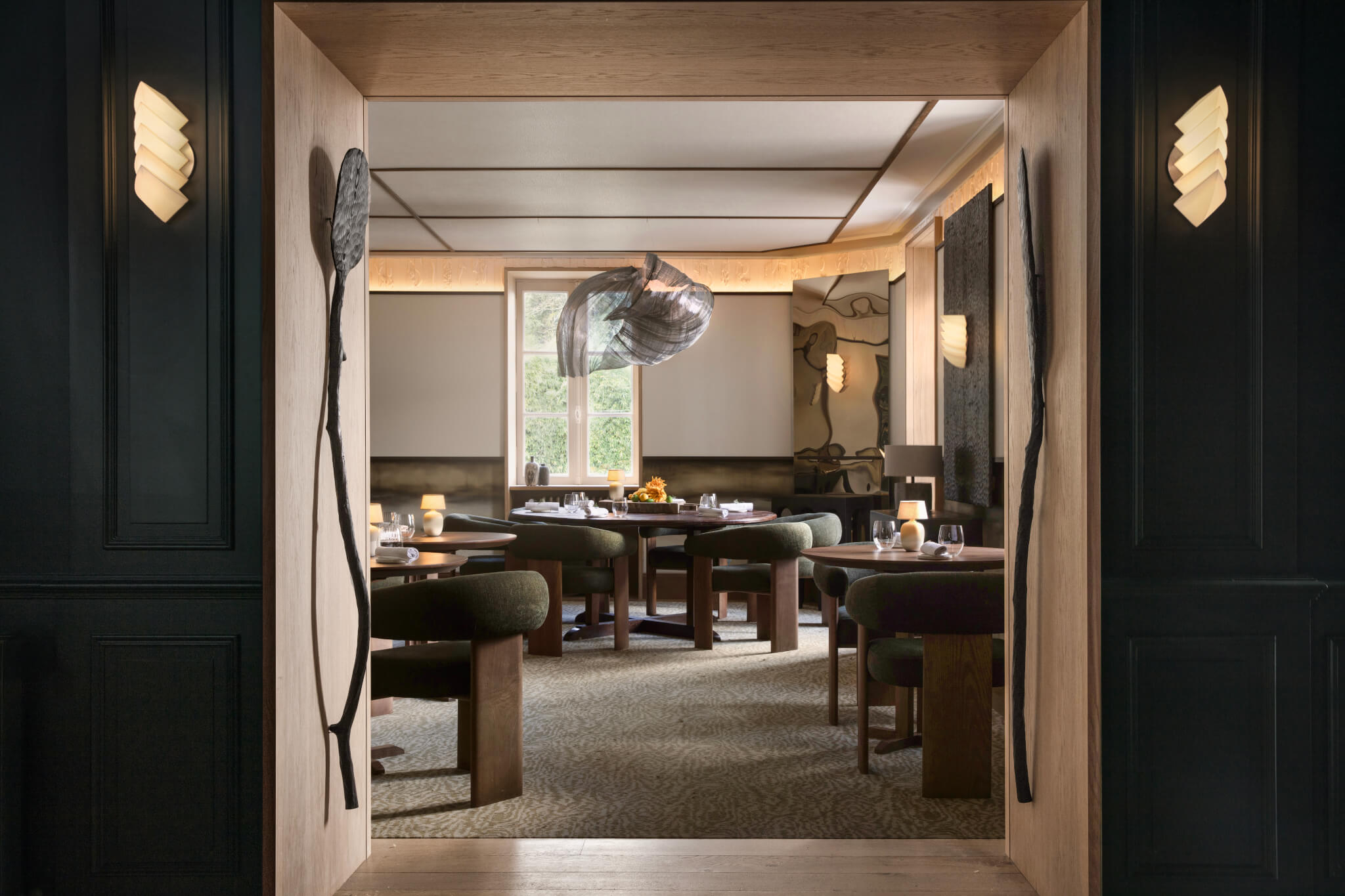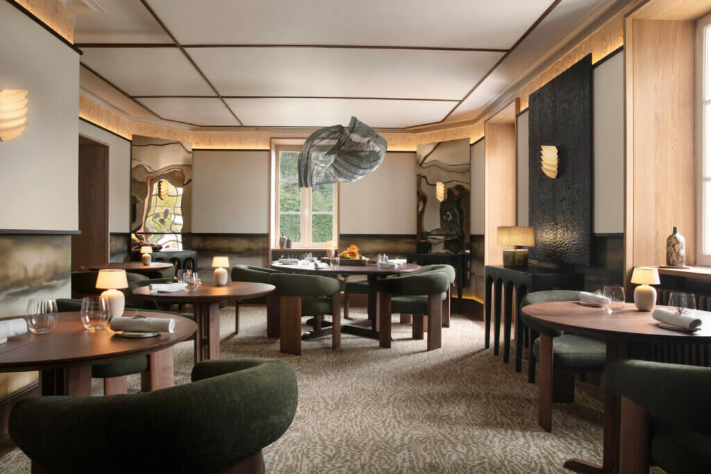 Début 2025, le restaurant a été entièrement repensé par l’architecte Aymeric Masson, avec pour ambition de faire de la salle un écho à la cuisine et à la nature environnante. Quatre artistes ont investi les lieux, dont la Belge Adeline Halot, qui signe deux rivières suspendues en lin et inox, tissées à la main. Le résultat ? Une mise en scène cohérente, où chaque choix participe à une expérience immersive. “Aujourd’hui, les différents salons racontent, chacun avec sa singularité, la même histoire que nos plats. Ils offrent plus de confort, plus d’intimité”, confie le chef.