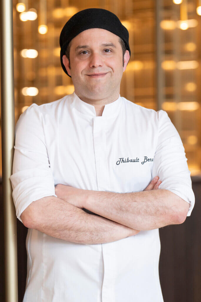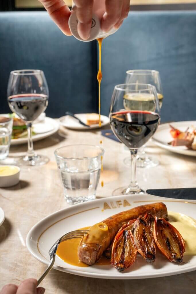 Le cadre vaut le détour à lui seul, notamment grâce à des éléments historiques d’époque conservés. Lustres majestueux, banquettes de velours bleu, magnifique bar d’origine et fresque monumentale des années 1930 du célèbre artiste local Julien Lefèvre, fils du fondateur, qui représente les provinces luxembourgeoises. C’est elle qui a inspiré l’identité chromatique des lieux : bleu pétrole, rose poudré, verts doux et doré. Quant à la touche locale, elle est également déclinée dans une série exclusive de porcelaines signée Jacques Schneider. Un lustre d’antan qui matche avec les codes contemporains et confère à cette brasserie déjà incontournable un cachet inédit.