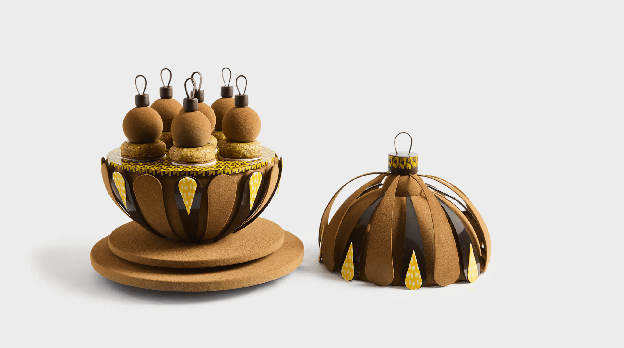 À l’image du chocolatier Pierre Marcolini, la Bûche Prestige convoque les fastes d’un palace des années 30, l’élan créatif d’une époque où l’Art Déco redessinait le monde. Une silhouette hypnotique, sculptée par l’imagination de Pierre Marcolini et le geste maîtrisé des artisans. « Je l’ai imaginée comme un hommage vibrant à un mouvement artistique qui m’a toujours fasciné par son équilibre entre rigueur et sensualité, lignes tendues et courbes libres. Les motifs Art Déco, leurs volumes, leur raffinement presque architectural, m’ont naturellement guidé » confie Pierre Marcolini. Noix fumées, spéculoos, trois grands crus de chocolat, crème brûlée à la cannelle et frisson inattendu : poivre Sansho. Bref, l’apothéose pour clôturer votre repas de fête.