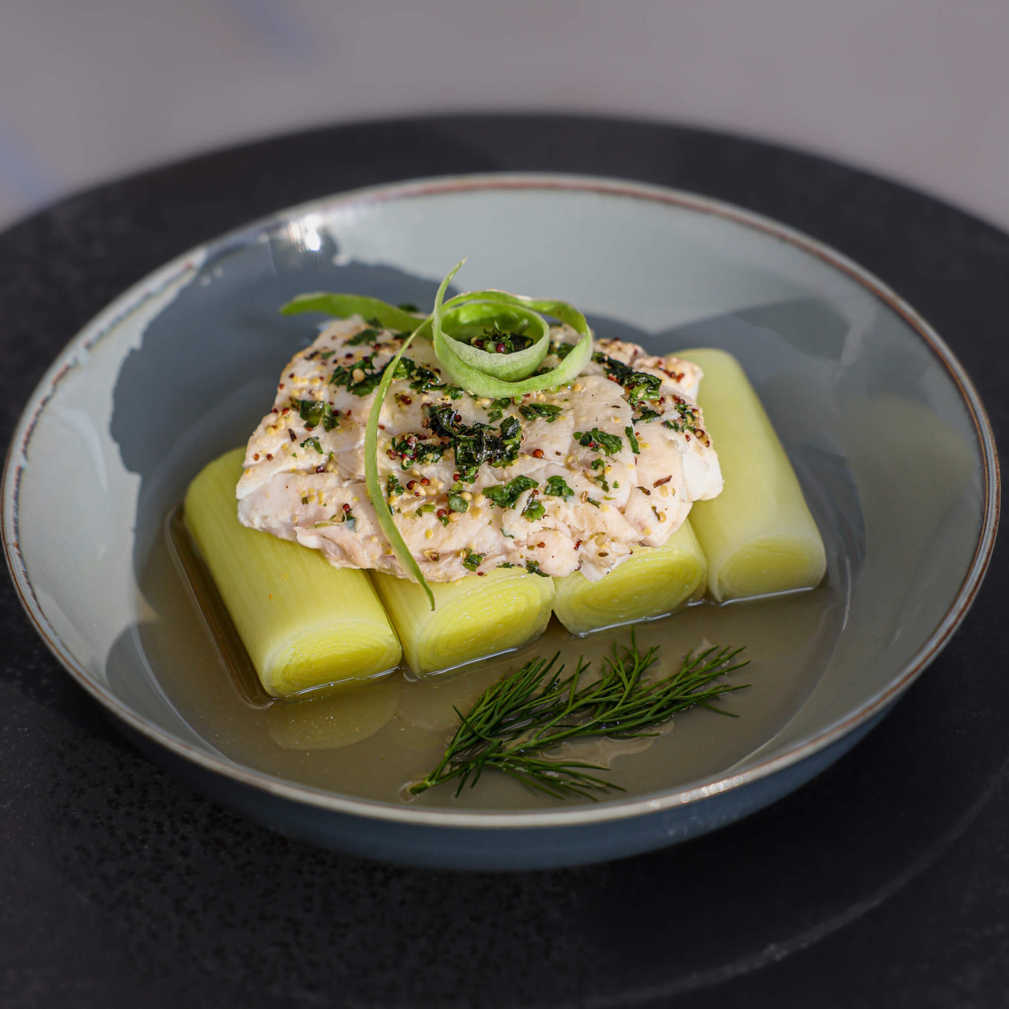 Disposer les poireaux dans une assiette creuse, déposer le cabillaud par-dessus, ajouter un ou deux rubans de pomme et verser le bouillon chaud autour, sans couvrir le poisson.