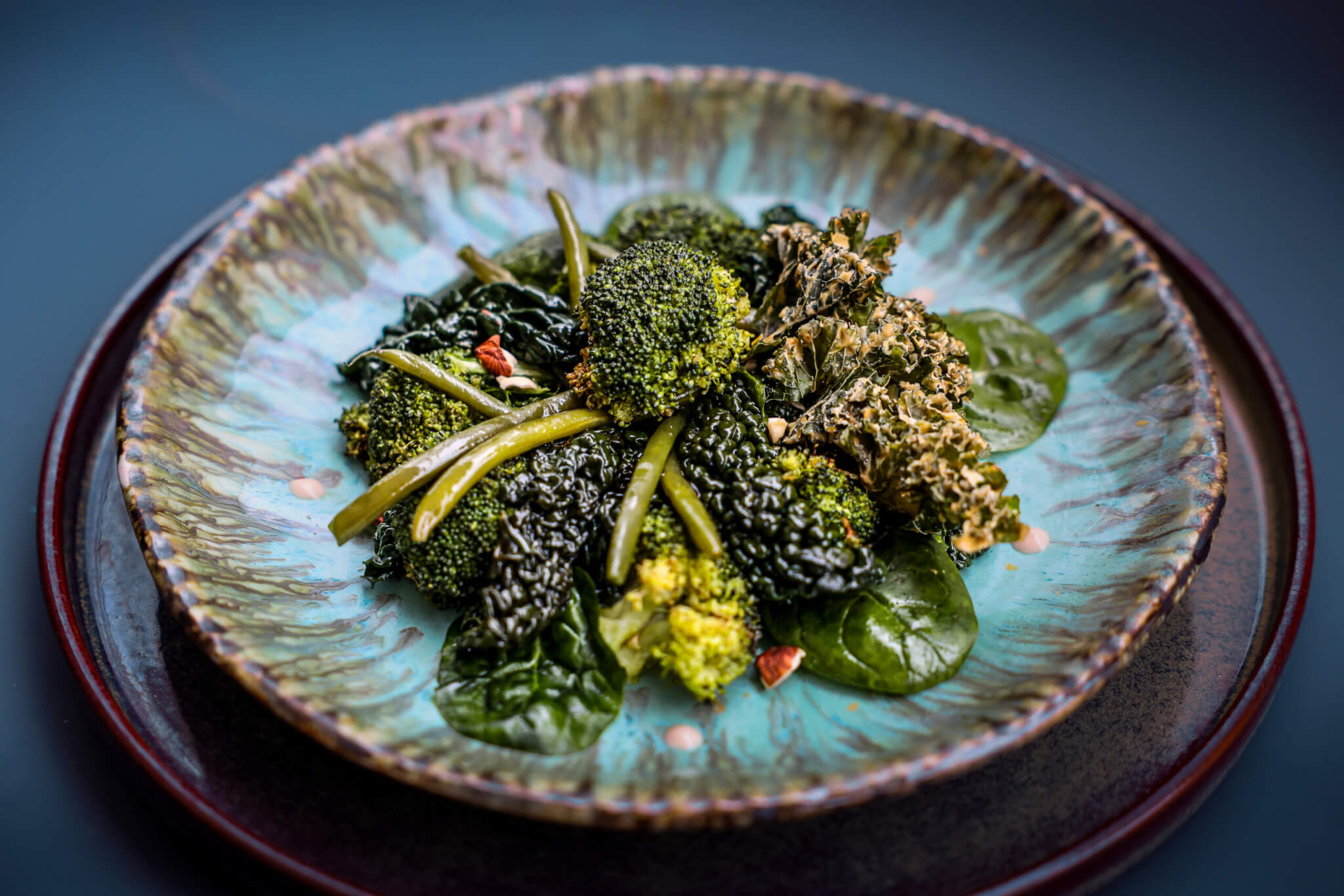 Mons. J’y ai retrouvé cette force des verts, cette manière de transformer le végétal en matière vibrante. J’ai eu envie de composer un petit paysage dans l’assiette, avec des volumes de brocoli, des lignes de haricots verts, des textures sombres de chou kale, des feuilles rondes d’épinard, quelques éclats dorés pour la chaleur et des touches de tahini comme une signature. Une cuisine qui parle de terre, de saison et de beauté – celle qui naît de l’intérieur.