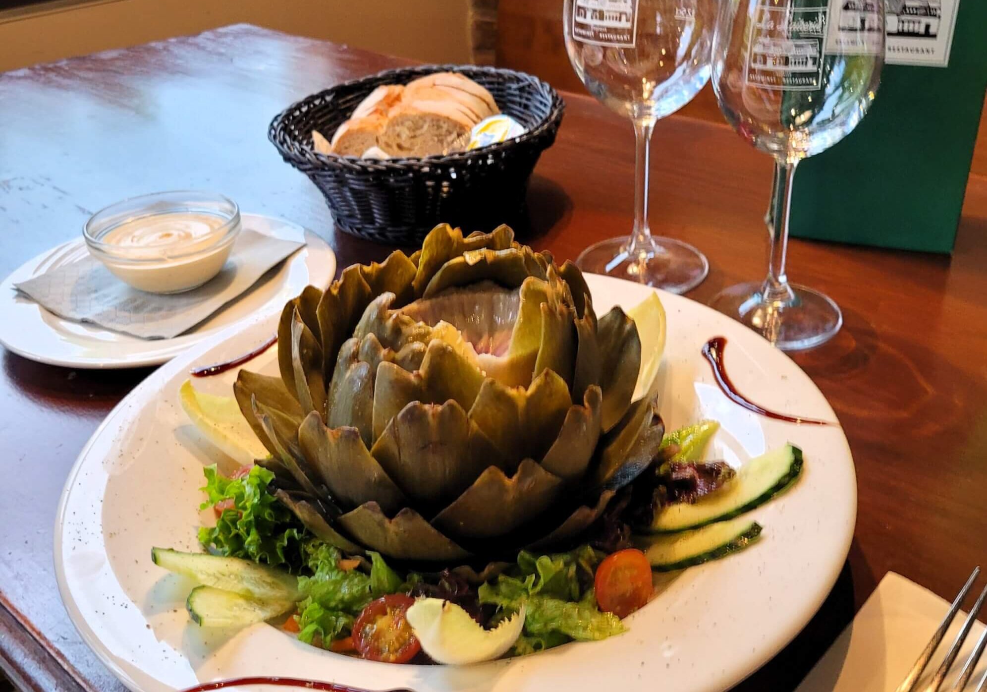 Le restaurant s’ouvre sur une première salle qui donne directement un indice sur ce qui se passe en cuisine : carreau de ciment sur le sol, larges poutres en bois clair apparentes au plafond, un bar en bois, lui aussi, coiffé d’un vrai comptoir en zinc… et surtout, une belle odeur de frites fraîches plongées dans la graisse de boeuf. Nous ne sommes pas encore installés, nous avons déjà faim. Pas de doute, nous sommes dans une brasserie, et de belle tenu qui plus est. Autour de nous, le restaurant est plein… plein d’habitués surtout. Voilà qui est bon signe.