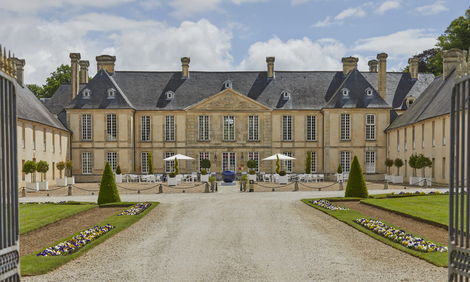 On est à vingt minutes de Bayeux, à peine plus de Caen. Pourtant, une fois passé le portail, on pourrait être beaucoup plus loin. Le domaine s’étend sur 25 hectares, dessinés avec cette élégance paysagère très française qui mêle rigueur et poésie : un jardin à la française pour la solennité de l’arrivée, puis un parc à l’anglaise qui se détend, s’échappe, se fait plus libre.