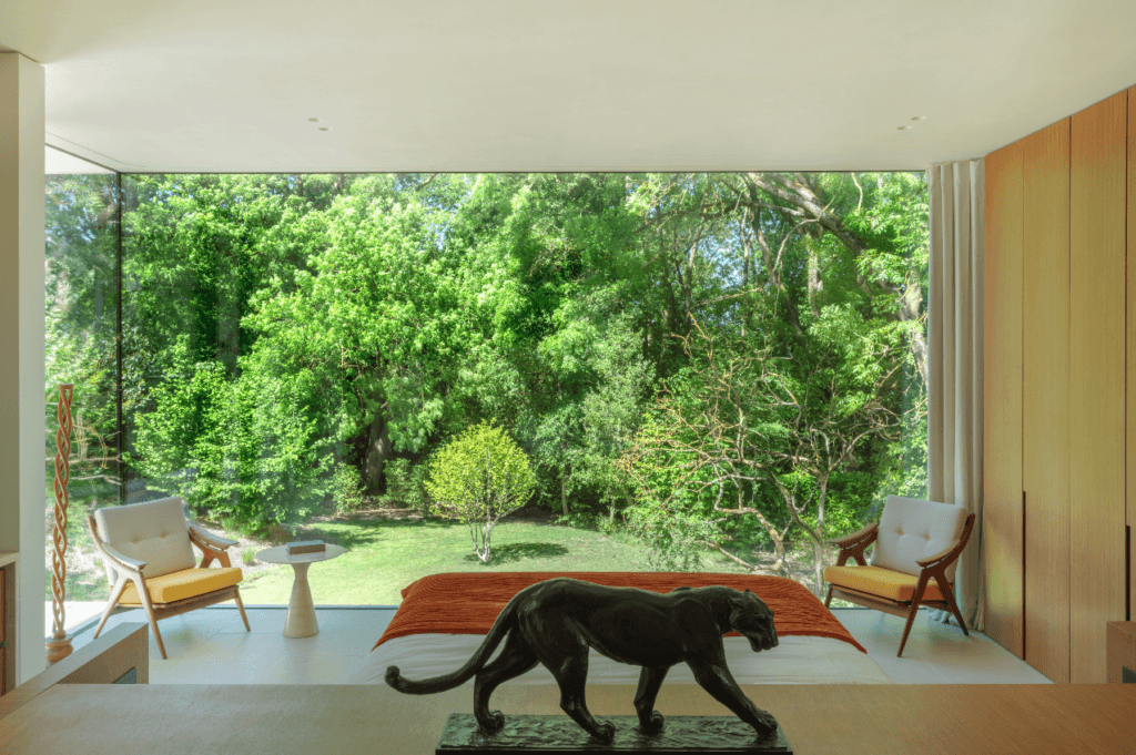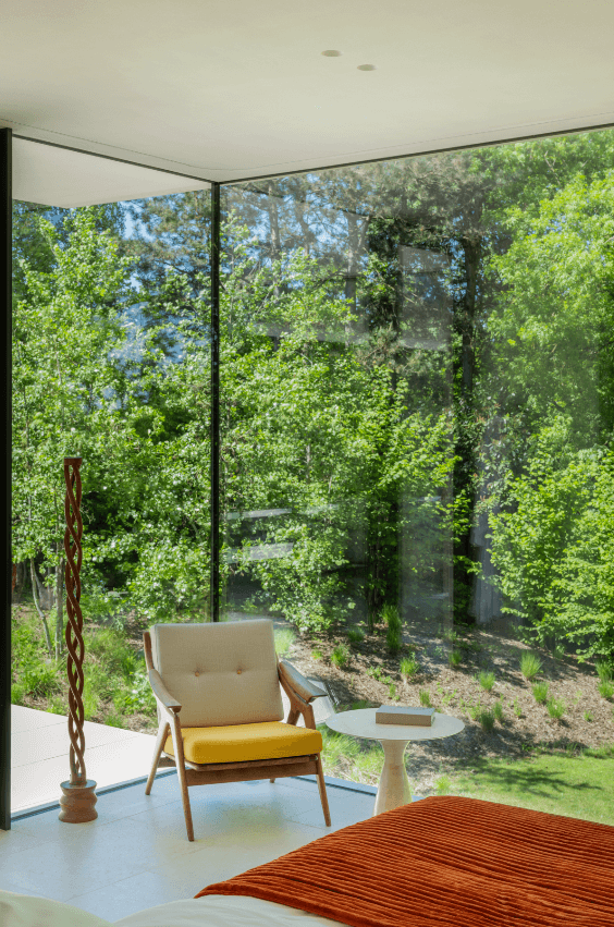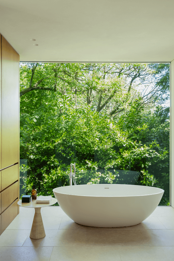 La salle de bains et la chambre à coucher s’ouvrent pleinement sur le jardin grâce aux larges baies vitrées qui rendent l’intérieur aux tons doux particulièrement lumineux.