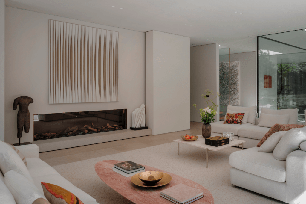 Dans le salon, qui s’ouvre sur la piscine hollywoodienne par une large baie coulissante, les teintes claires dominent et participent à l’atmosphère douce et reposante des lieux. Devant la cheminée dominée par un tableau dû au belge Jean-Philippe Duboscq et ornée d’une Composition blanche en marbre de Carrare de l’Uruguayen Pablo Atchugarry, s’ordonne un ensemble de canapés modulables de la marque de design italien Flexform posé sur un tapis de sol crème. Quelques coussins et deux tables au plateau en travertin rose signées Angelo Mangiarotti apportent une touche de couleur discrète. Sur l’une d’elles a été posée une sculpture Seed de la belge Catherine François, en bois et bronze. Propice à la détente, le salon apparaît comme la pièce centrale de la maison et communique aussi bien avec la chambre qu’avec la salle à manger, le hall ou la cage d’escalier, en créant des perspectives étudiées qui suggèrent seulement ou s’ouvrent pleinement, suivant le sofa choisi pour une halte bienvenue.