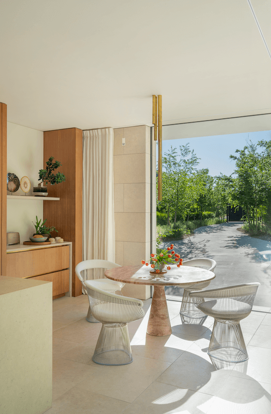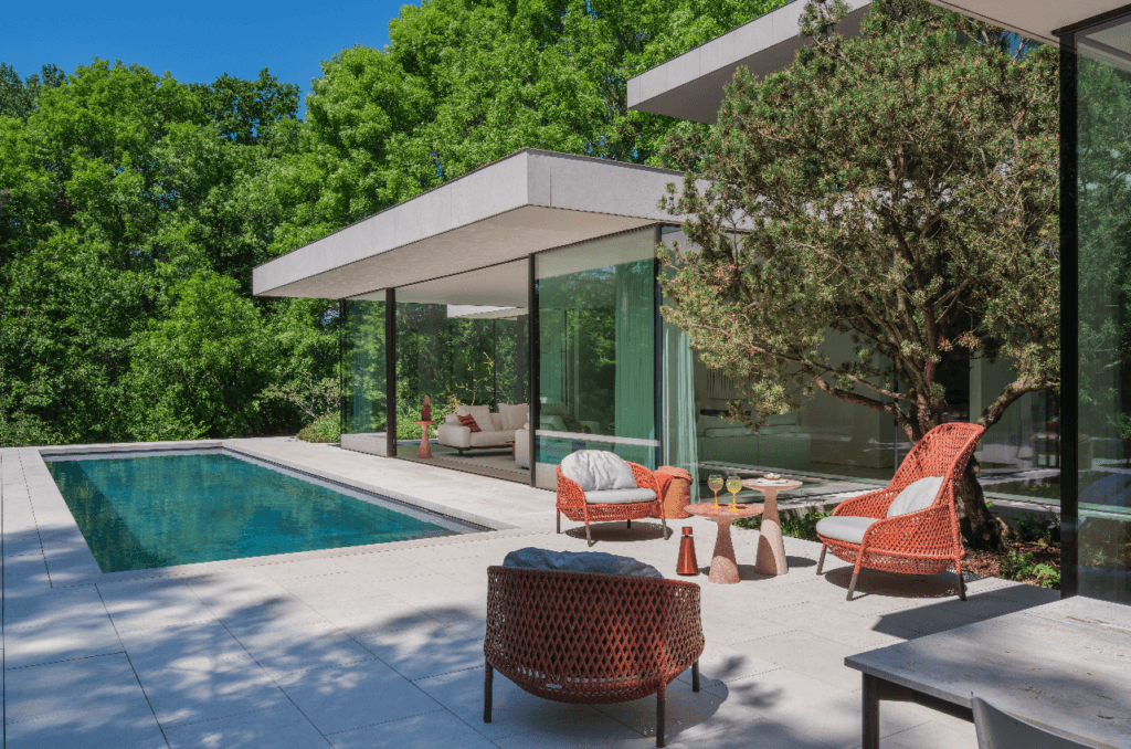 Deux œuvres majeures rehaussent les murs blancs prolongeant l’entrée, une composition cloutée de Günther Uecker, un important artiste allemand membre du groupe ZERO qui vient de décéder en juin, à 95 ans, et une Pittura R écarlate de Pino Pinelli, un poète artiste qui nous a quitté en 2024. Une baie vitrée sépare le hall de la cage d’escalier aux marches en bois. L’architecte a multiplié les lieux conviviaux avec tout d’abord la salle à manger présentant une table au plateau de travertin romain qu’entoure un ensemble de chaises Wishbone de la firme danoise Carl Hansen dont l’existence remonte à 1908. Elle s’ouvre sur la cuisine où une table ronde et des chaises du designer américain Warren Platner occupent le coin déjeuner qui surplombe l’entrée carrossable donnant accès à la maison. À l’extérieur, même esprit convivial avec un espace salon doté d’un ensemble de fauteuils corail de la firme allemande Dedon, bien connue pour son mobilier d’extérieur résistant aux variations climatiques, et un espace repas où l’on s’attable volontiers pour goûter aux joies d’un déjeuner ensoleillé ou d’un dîner à la lueur des bougies. Réminiscence méditerranéenne, un pin a été planté ici en 2022.