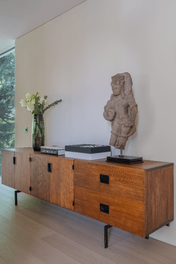 Clin d’œil à la passion du propriétaire pour l’art égyptien, les terrasses comme les murs extérieurs et les sols intérieurs ont reçu un parement de marbre au ton doux et laiteux en provenance du pays des pharaons. La décoration reflète son goût marqué pour le design et l’art contemporain. Conseillé par la Boon Gallery, il a ainsi pu réunir des œuvres d’artistes de renom qui côtoient parfois des sculptures plus anciennes, issues d’un héritage familial, qu’il s’agisse d’un torse en grès poli, dans le style d’Angkor Vat, du XIe siècle, d’un buste figurant Kuan Yin, déesse chinoise de la compassion, datant du VIIIe siècle, sous la dynastie des Tang, ou d’une statue indienne du Gujarat exécutée au IXe siècle de notre ère.