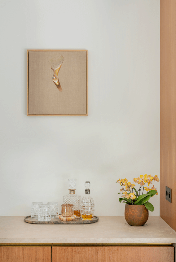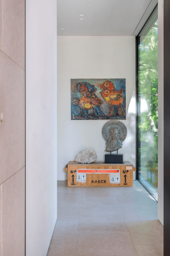Deux chambres et une salle de bains à bassin de marbre s’approprient le reste de l’étage qui a été parqueté. Partout, les touches chaleureuses de placage et de laiton témoignent des finitions soignées dont a bénéficié le projet qui, outre le mobilier sur mesure, propose nombre d’éléments personnalisés résultant du dialogue établi entre l’architecte et le propriétaire. À l’intérieur, on découvre aussi des sonatines artistiques qui s’offrent comme autant de cadeaux visuels, et ce, dès l’entrée principale. En effet, une fois la porte poussée, Deux Figures du Néerlandais Karel Appel accueillent les invités. Dans la cuisine, une toile du peintre sud-coréen Kim Tschang-Yeul révèle cet univers de la goutte d’eau qui le fascine depuis plusieurs décennies et qui a fait sa réputation. On citera également d’autres noms représentés dans la collection, comme ceux de l’Américain Sam Francis, de l’Allemand Otto Piene, du sculpteur sud-coréen Chun Kwang Young, du vidéaste suisse MARCK ou encore du designer néerlandais Cees Braakman. Ces valeurs sûres s’unissent au design et à une architecture au dépouillement raffiné pour faire de la Villa P. un cocon à l’harmonie unique.