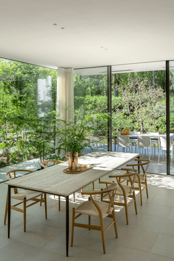 Achevé en 2022, le projet résulte d’une alchimie parfaite entre le propriétaire, amateur d’art averti, et l’architecte Steven Vandenborre dont les réalisations revisitent le courant moderniste qui, dans notre pays, cohabita avec l’Art déco entre 1910 et 1930. Ces dates ne constituent toutefois qu’un repère imprécis, puisque le mouvement se poursuivit bien au-delà et trouvera une continuité à travers le postmodernisme et la période contemporaine. Les grands arbres de la parcelle ont été préservés et ombragent cette villa moderne dont l’implantation respecte la pente naturelle d’origine. Partiellement enterré, le sous-sol aux parois boisées abrite des espaces de rangement, les locaux techniques et une galerie d’exposition qui s’ouvre sur un jardin privé. De l’extérieur toutefois, point de fenêtres mais un effet miroir qui reflète la végétation. On y trouve également le garage dont la porte a été ménagée dans la partie basse de l’une des ailes latérales de la maison, celle-là même dont la silhouette s’inspire librement de la sculpture Signal de Jacques Moeschal, située à Bruxelles. De larges dalles disposées en escalier mènent à une entrée latérale minimaliste. Déjà, la vue d’ensemble qui s’offre aux visiteurs depuis l’allée d’accès permet de mesurer l’importance accordée aux surfaces vitrées qui inondent de lumière les pièces de vie du rez-de-chaussée comme celles de l’étage, dans un dialogue permanent avec la nature environnante.