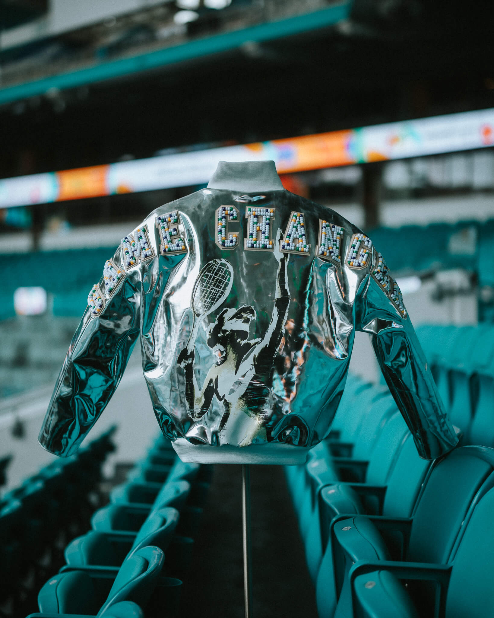 Confectionnée en cuir italien à l’éclat miroir, la pièce capte la lumière comme autant de trophées accumulés au fil d’une carrière hors norme. Le vêtement devient surface de réflexion – au sens propre comme au figuré – d’un parcours jalonné de victoires, de combats et d’avancées décisives pour l’égalité dans le sport.