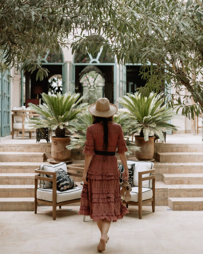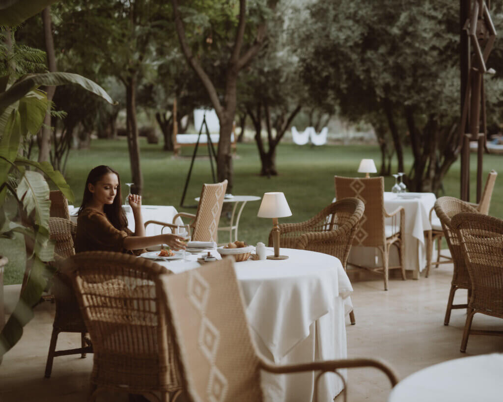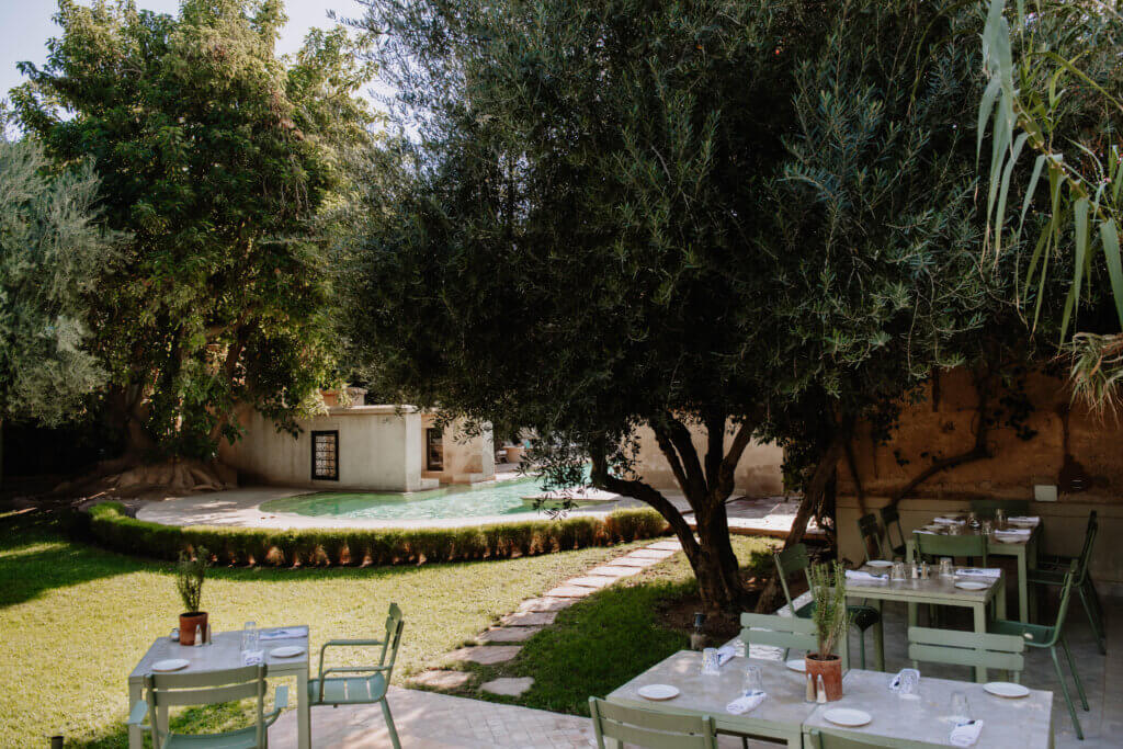 L’établissement compte quarante-quatre chambres et suites nichées dans des pavillons intimistes aux patios ombragés. Jardins luxuriants avec bassins, potager bio et oliviers centenaires créent une atmosphère de retraite secrète. Le chef Noureddine Moani y propose une cuisine de terroir utilisant les récoltes du potager. Mohamed Hejjaj assure la direction de cette adresse où, selon la formule consacrée, « le temps semble suspendu ».