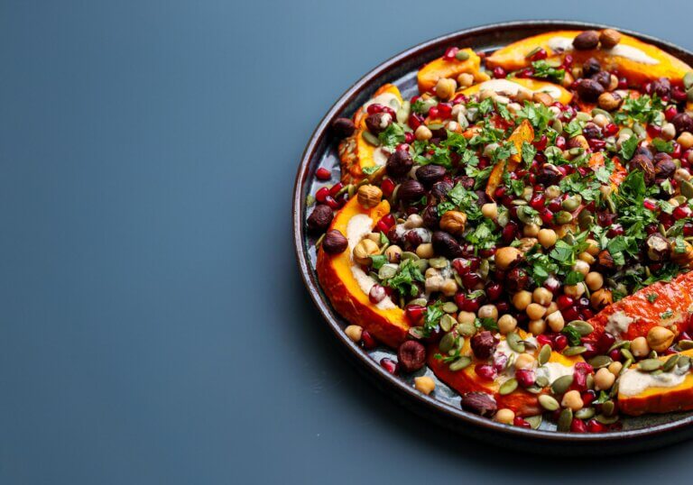 Salade tiède “Cléopâtre” au potimarron rôti, tahini & huile d’argan