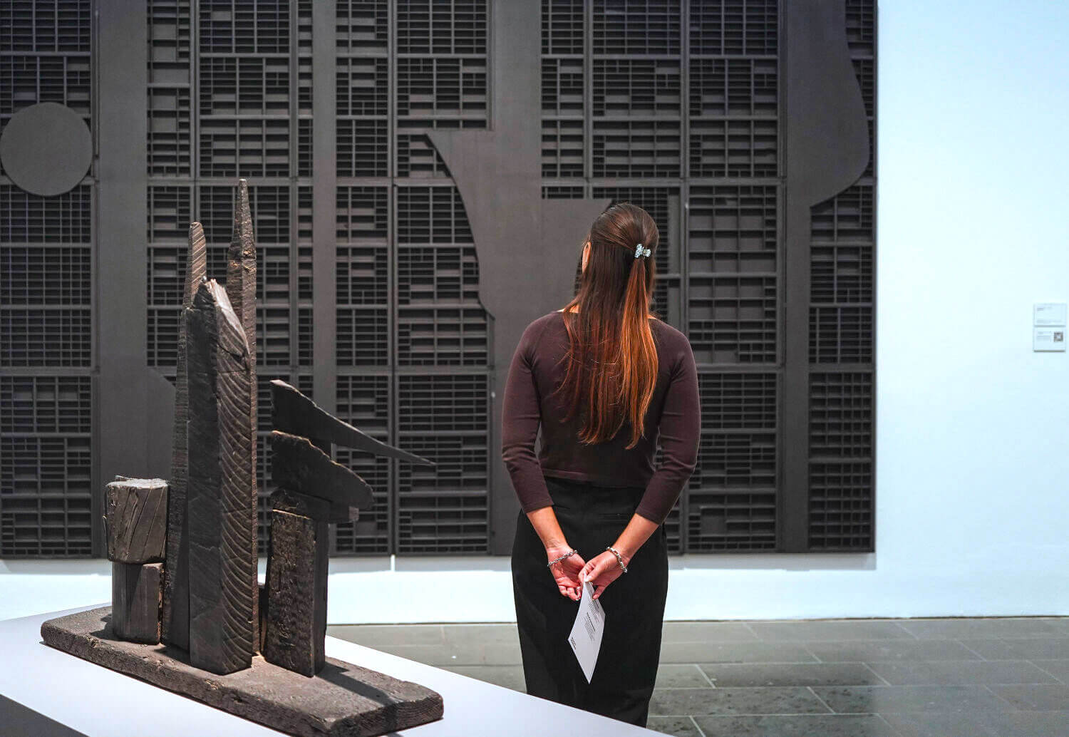 Museum Wiesbaden célèbre les trente-cinq ans de la présence de Louise Nevelson (1899-1988) dans l’exposition Women Artists of the 20th Century par une importante rétrospective. Reconnue pour ses assemblages monumentaux, elle compose des sculptures monochromes qui égalisent chaque fragment, abolissant toute hiérarchie. La couleur surgit dans ses collages: formats plus intimes où papiers, matériaux trouvés et rythmes inattendus dialoguent, tels des échos miniatures de ses sculptures. Une dizaine d’assemblages majeurs et plus de cinquante collages issus de différentes périodes révèlent une artiste intuitive pour qui collectionner, accumuler et recomposer est un geste vital. “Je ne cherche pas la perfection. Je cherche la vie”, disait-elle.