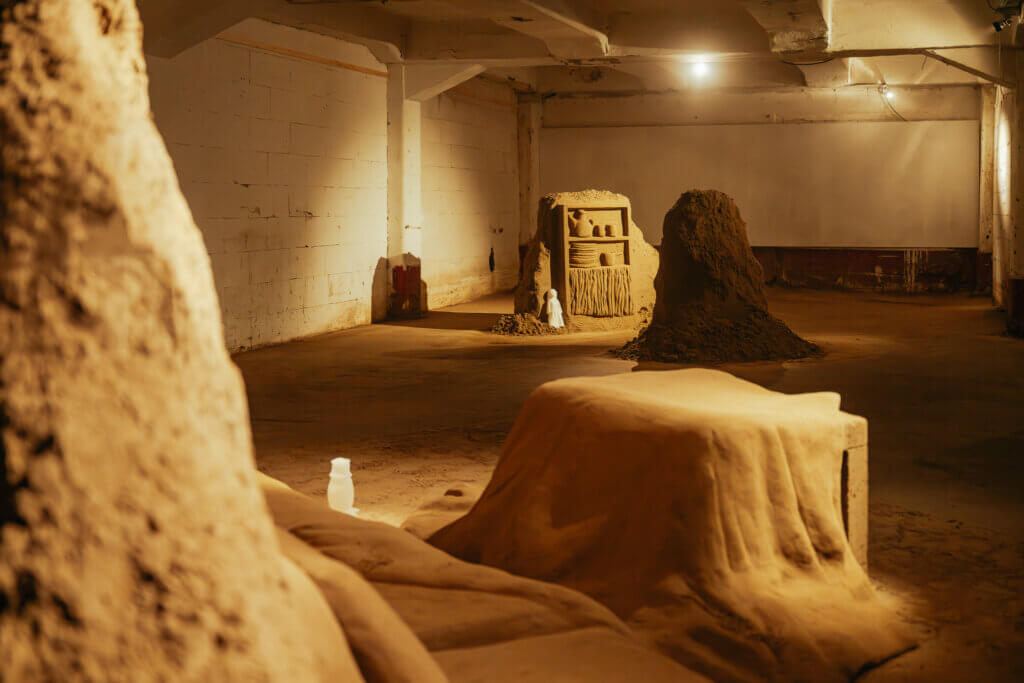 Elle y ressuscite les souvenirs de son enfance à Kaboul à travers des sculptures de sable et d’albâtre, mais aussi des photos de famille imprimées sur terre battue. En bande sonore, le son lancinant d’une machine à coudre. Pour la première fois, l’artiste taille également la pierre : elle creuse l’albâtre de l’intérieur jusqu’à obtenir une coque translucide, fragile, métaphore poignante de l’usure invisible de la précarité. À travers cette œuvre immersive, Narges Mohammadi interroge la vulnérabilité, la résilience et le besoin fondamental de sécurité. Elle livre ici l’un de ses projets les plus intimes.
