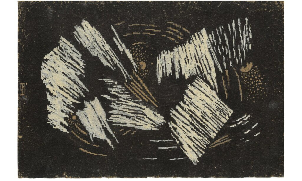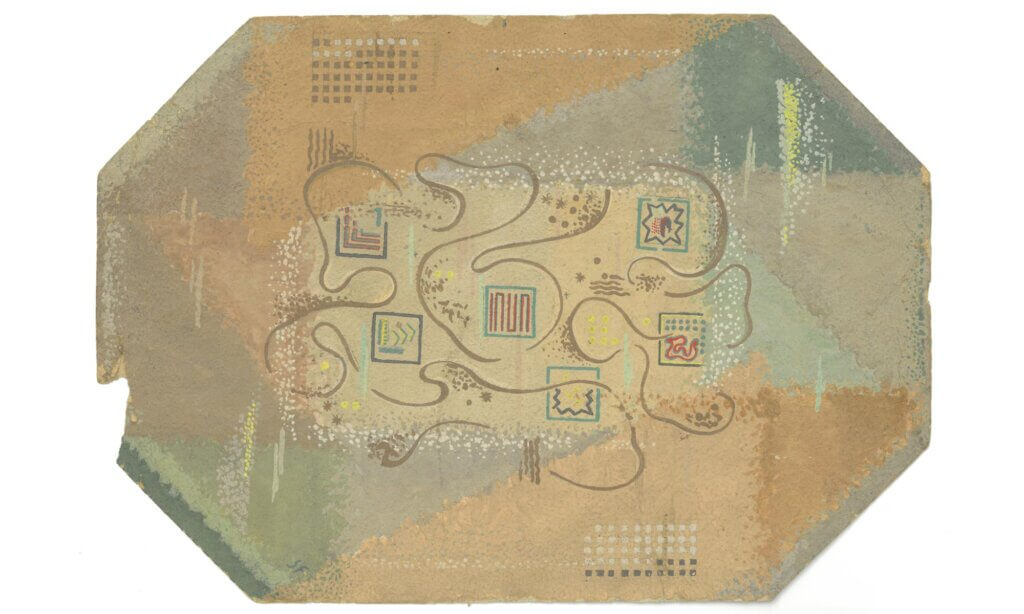 Élèves de Paul Follot, directeur de l’École nationale supérieure des Arts décoratifs de Paris, c’est là que René Baucher (1902-1983) et Sylvie Féron (1898-1984) se sont rencontrés. À la fin de leurs études, ils sont recrutés par leur professeur, également créateur, en 1922, de l’Atelier Pomone, département de décoration intérieure du grand magasin parisien Le Bon Marché. De cette collaboration naîtront notamment le tapis Pégase et la moquette Giotta. En participant à l’Exposition de 1925, Sylvie Féron se fait remarquer par deux autres modèles de tapis : l’un est présenté dans la galerie de l’Esplanade des Invalides, et l’autre dans l’espace de la Boutique d’art. Elle expose aussi un tissu de coton imprimé de motifs géométriques, baptisé Papillon. Quant à l’exposition actuelle du Design Museum Brussels, celle-ci dévoile des projets d’études réalisés de 1924 à 1926, des aménagements d’intérieur, des décors de cinéma, des bijoux…