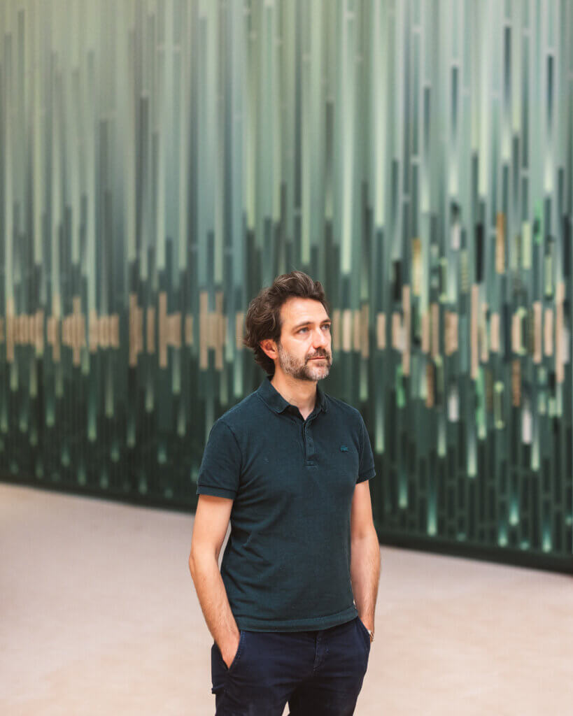Portret van Mathieu Bassée, artistiek directeur van Studio MTX, voor het monumentale gordijn gemaakt voor de heropening van het Grand Palais door Maisons d'Art Le 19M. Philippe Servent