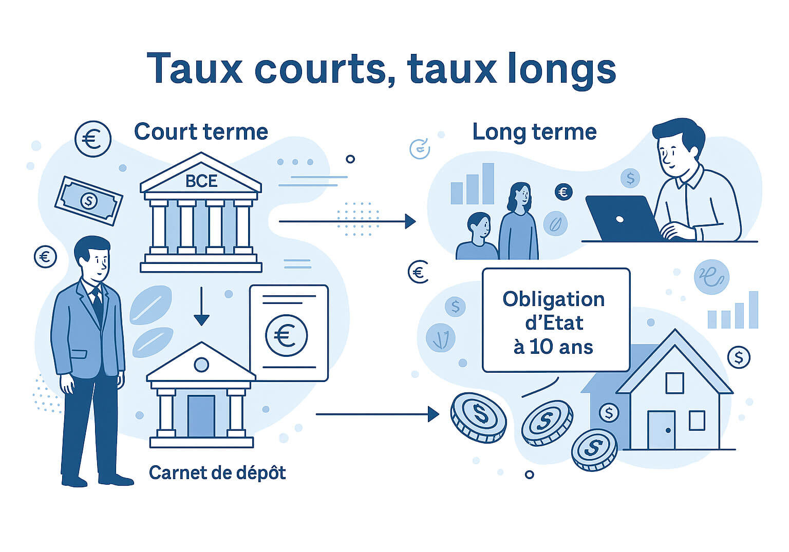 En fixant le niveau de ses taux directeurs, une banque centrale détermine les taux d’intérêt à court terme dans l’économie, en particulier le rendement que les banques commerciales proposent sur les carnets de dépôt ; les deux sont intimement liés. Mais en modifiant son taux de base, elle envoie aussi un message à l’ensemble des acteurs économiques. De sorte que la détente des taux à court terme va souvent déteindre sur les taux à long terme. Ce sont de loin les plus importants : taux des crédits hypothécaires, des crédits aux entreprises, rendement des obligations, etc.